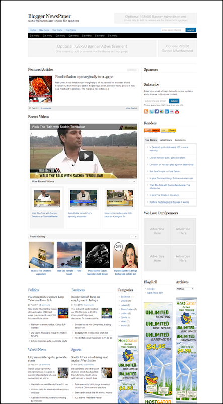 Найдите <p class = 'email-form'> и замените ' welcometospicytricks ' на ваш URL-адрес feedburner. Мне было трудно найти время для создания этого шаблона, и я надеюсь, что вам, ребята, понравится эта работа. Вычеркните ваши предложения и мысли и вопросы, добавив свои комментарии. Обновление: ссылка для скачивания обновлена и исправлена ошибка изображений только для этого шаблона. Обновление: исправлены ошибки JavaScript. Теперь скрипт загружается очень быстро и задерживает время загрузки страницы. Я запустил еще один шаблон Blogger, связанный с сайтами новостей и технологий. Ознакомьтесь с шаблонами Blogger NewTimes